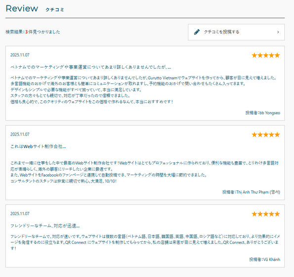 Customer reviews posted on your Google Business Profile are automatically imported to your store page on ぐるっと東京. Furthermore, reviews written in foreign languages are automatically translated into Japanese, and Japanese reviews are translated into multiple languages such as English, Chinese, and Korean for publication.
