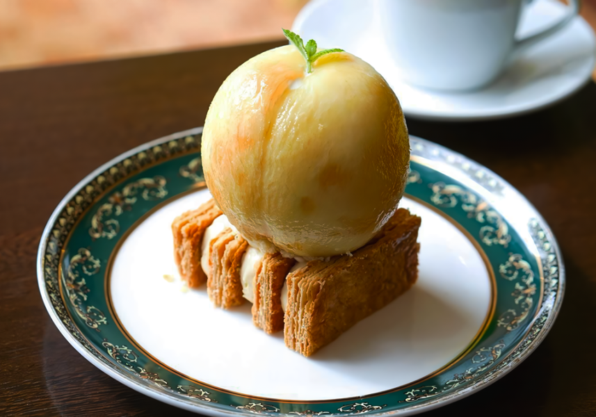 Our made-to-order mille-feuille, carefully crafted one by one, is a standout dessert that highlights the puff pastry’s crisp texture and toasty aroma. Because we use seasonal fruits at their peak, you’ll discover a new flavor with every visit. Our summer-only "Peach Mille-Feuille" is especially popular, and reservations are essential.