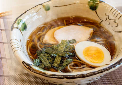 The soba at RAKUJYO is served with a house-made broth using premium katsuobushi from Yaizu, Shizuoka, but it goes beyond plain soba. Seasonal flavors are prepared so that young guests and visitors from overseas can enjoy them. In response to growing health-consciousness, there are also many fully plant-based vegan soba options, making the menu appealing for dietary diversity.