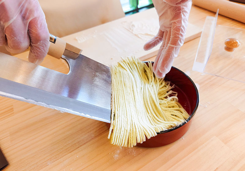 The greatest feature of RAKUJYO is how it reimagines the traditional soba-making process so anyone can enjoy it in a short time. In particular, the “cutting” step of slicing soba thinly and evenly is praised for its depth and enjoyment. With this original, streamlined technique, even beginners can try authentic Shinshu 100% buckwheat soba or a unique ramen-cutting experience and savor a superb sense of accomplishment.